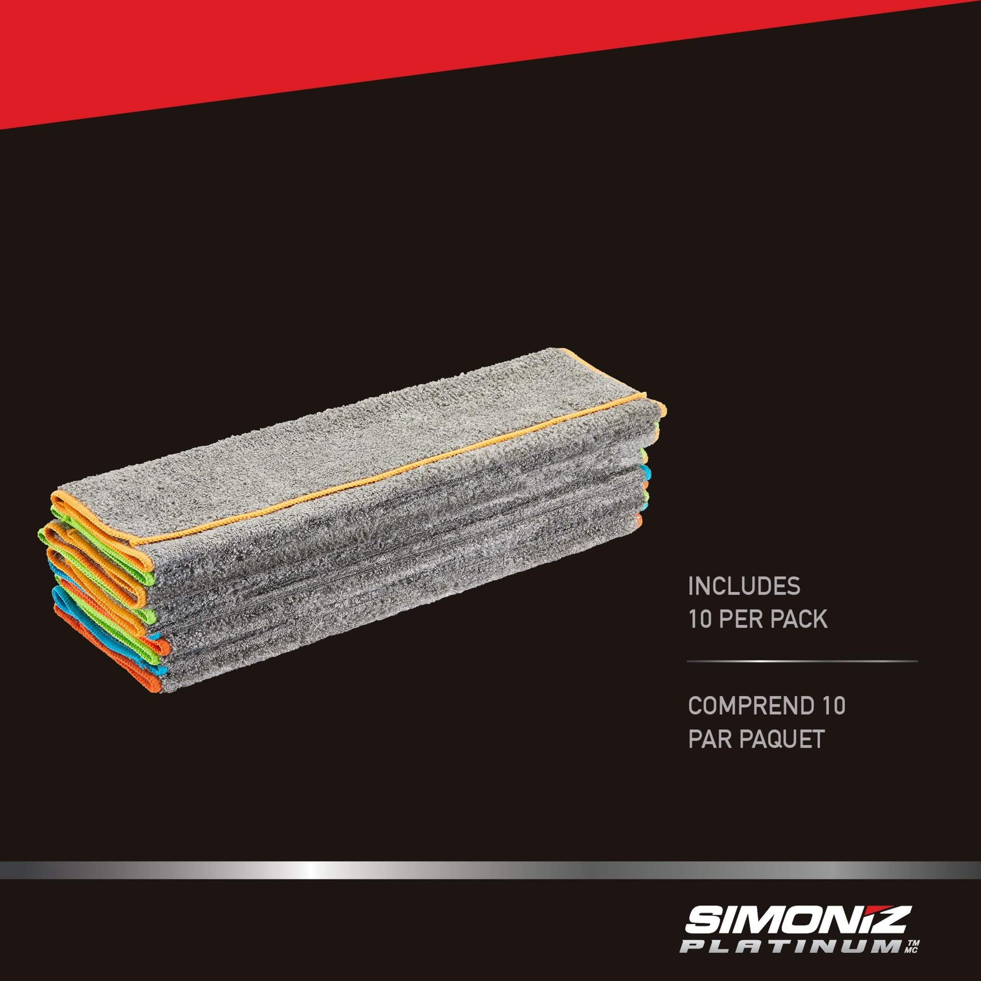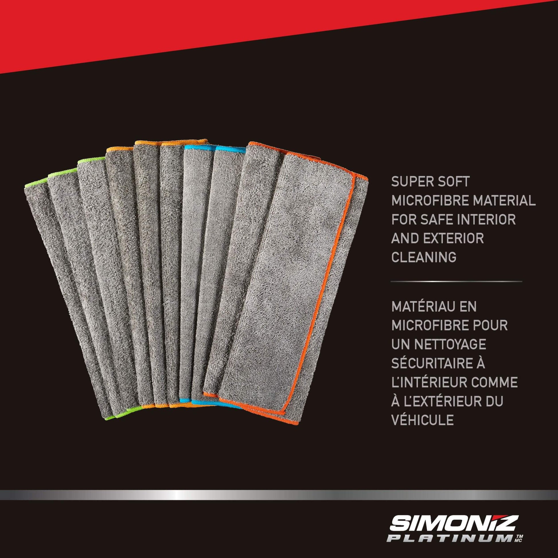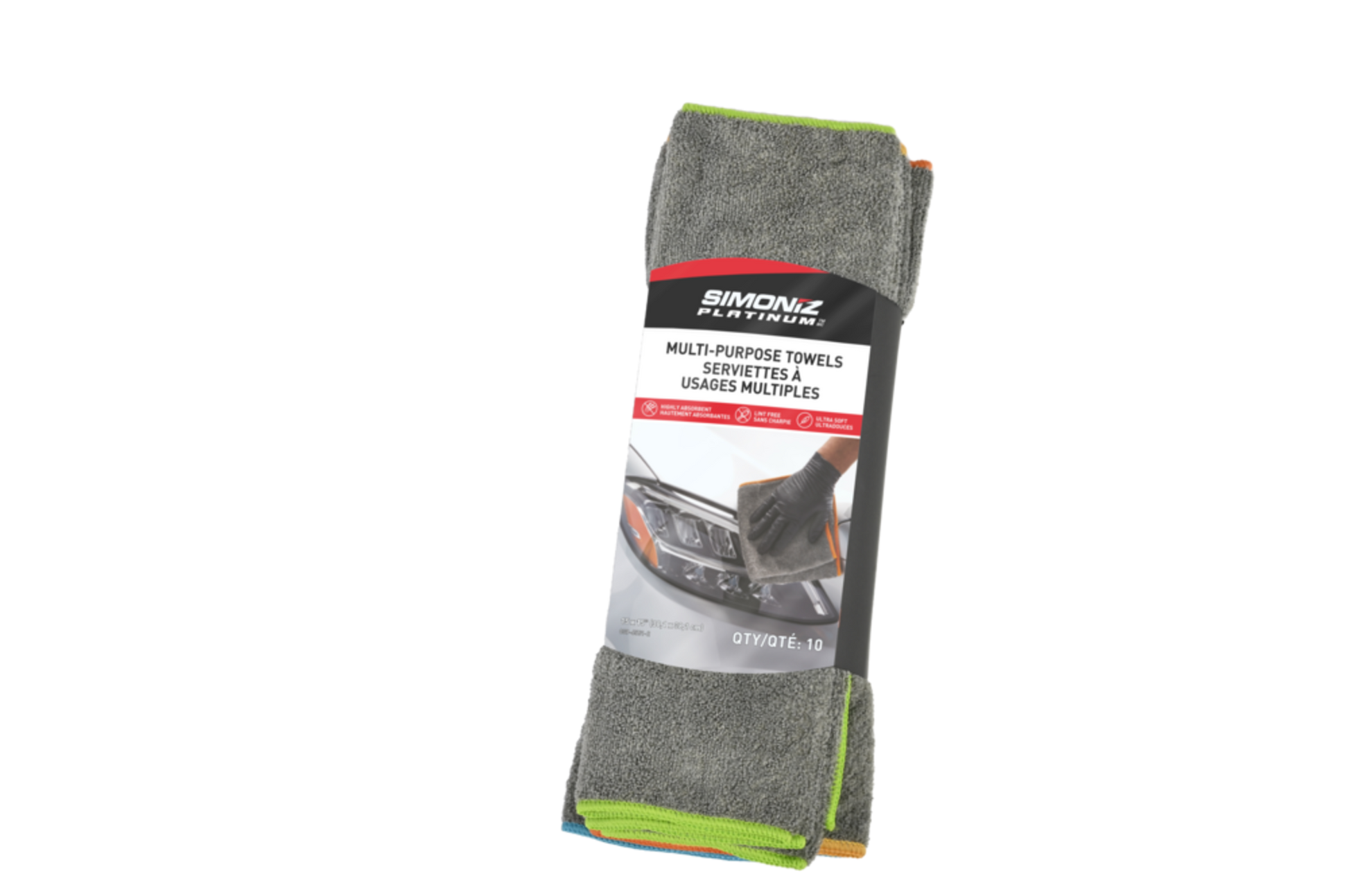 The SIMONIZ Platinum Multi-Purpose Towels 10-Pack contains towels made from super-soft microfiber material to enable safe interior and exterior cleaning. The microfiber towels in this pack are highly absorbent and feature a lint-free weave for more delicate detail work. The towels feature different colored edges to differentiate tasks. SIMONIZ microfiber towels are safe for use on leather, vinyl, plastic, glass, and vehicle paint, which makes them an ideal choice for use as an all-purpose car towel.